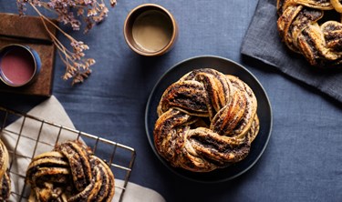 Den Teig auf einer bemehlten Arbeitsfläche in 6 Stücke teilen. Diese jeweils rechteckig auswalken, mit 2 EL der Mohnmasse bestreichen und eng einrollen. Die gefüllte Teigrolle Länge nach mit einem scharfen Messer aufschneiden, und die zwei dadurch entstandenen Stränge mit der Füllung nach oben wie eine Kordel zusammen schlingen. Im Anschluss die Enden aneinander drücken, sodass ein Kränzchen entsteht. So mit dem weiteren Teig verfahren.