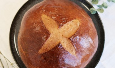 Danach mit dem verquirlten Ei bestreichen, ein Kreuz einschneiden und bei 200 °C Ober- und Unterhitze ca. 40 Minuten backen.