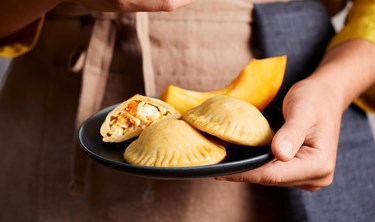 Mit einem runden Ausstecher (alternativ: Wasserglas/Schüssel), Durchmesser 10 cm, Kreise ausstechen. Nun etwa einen Esslöffel der Kürbismasse in die Mitte eines Teigkreises geben, den Rand mit einem verquirlten Ei bestreichen und einen zweiten Teigkreis darauf setzen. Mit einer Gabel die Ränder zusammendrücken, dadurch entsteht ein Sonnen-Muster. So weiter verfahren, bis Teig und Füllung aufgebraucht sind.