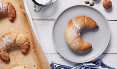 Den Teig auf eine leicht bemehlte Arbeitsfläche geben und rechteckig auswalken (3 – 4 mm dick). Mit einem Messer längliche Dreiecke aus dem Teig schneiden, dann je einen gehäuften Teelöffel der Fülle darauf verteilen und von der breiten zur schmalen Seite hin aufrollen. Die Enden jeweils nach unten biegen, um Kipferl zu formen. Auf das Backblech setzen.