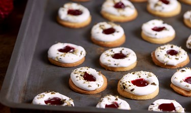 Währenddessen Eiklar mixen und mit Staubzucker ausschlagen. Die Masse in einen Spritzsack füllen, Ringe auf die vorgebackenen Kekskreise spritzen, mit Kürbiskernen bestreuen und für weitere 20 Minuten im Ofen trocknen.